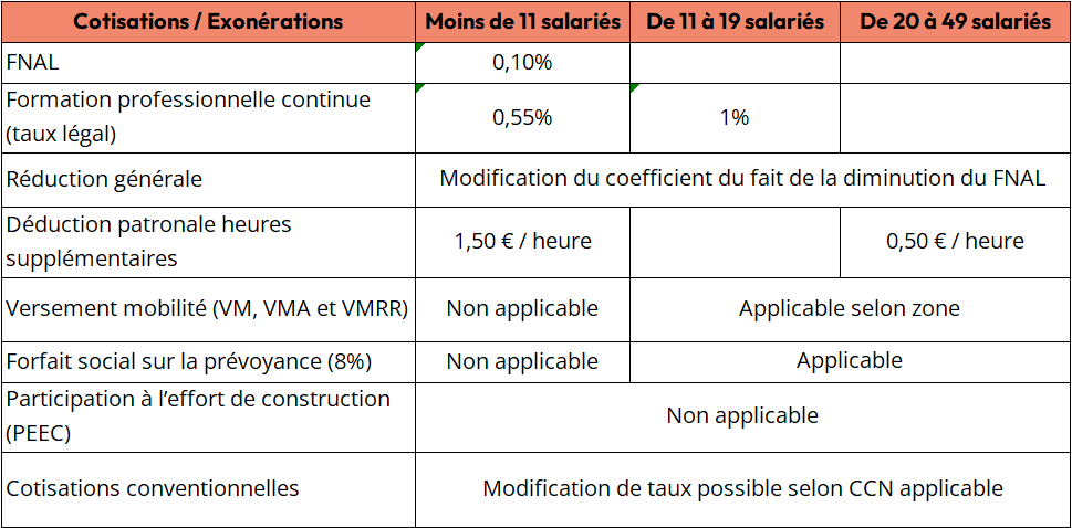En fonction du nouveau seuil d’effectif applicable, certaines cotisations et exonérations sociales ont été modifiées ou supprimées dès janvier 2025 :